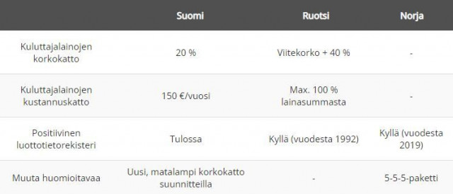 Tässä artikkelissa vertaillaan Suomen nykyistä korkolakia Ruotsin ja Norjan käytäntöihin. Kuten alta käy ilmi, on Suomessa tällä hetkellä kaikista matalin korkokatto, mitä ollaan mahdollisesti madaltamassa entisestään.