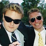 4. Dotcom-urho Janne ”Bono” Waltonen ja alppihiihtovalmentaja Tuomas ”Keke” Turkama päätyivät kesän aurinkolasimuodin esittelyyn. |