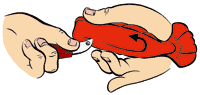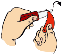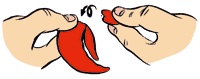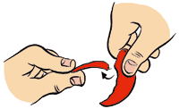 - Saksen paksumman osan kärki katkaistaan rapuveitsen reikäosalla. Ryystetään. Muu osa kuoresta halkaistaan veitsen terän avulla.