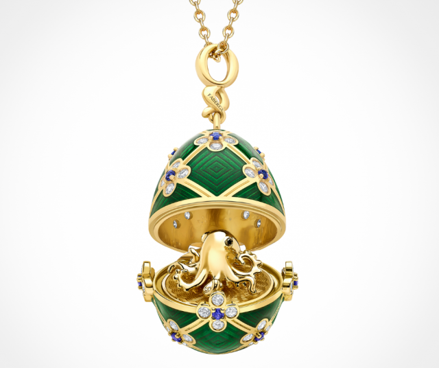 Riipus on yksi 50 kappaleen erästä: vihreällä emalilla koristeltu kultamuna, jossa on 183 timanttia ja kaksi safiiria. Kun se avataan, esiin tulee ylellinen kultainen mustekala – pieni kunnianosoitus Octopussyn maailmalle.