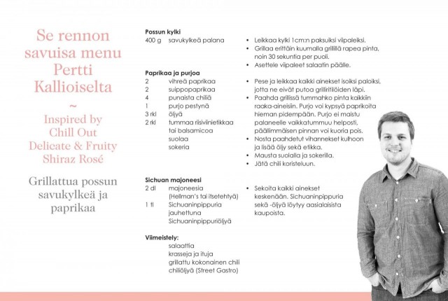 Ensimmäisessä menuehdotuksessa Pertti on rakentanut reseptin Chill Out Delicate & Fruity Shiraz Rosén ympärille. Rosét ja kesän grillaukset mielessään Pertti yhdistää savuisia aromeja raikkaan marjaisiin makuihin. Lisää reseptejä löytyy Chill Outin Facebookista.