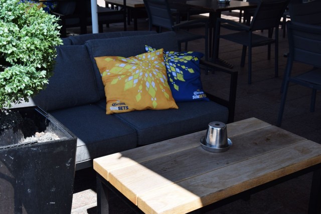 Terassilla on ihanaa ottaa rauhassa tuoppia. Aurinkovarjojen alla kelpaa köllötellä säällä kuin säällä.