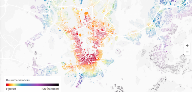 Tämä kartta kertoo, missä Helsingissä kannattaa asua, että pääsee helposti julkisilla duuniin ja oluelta himaan
