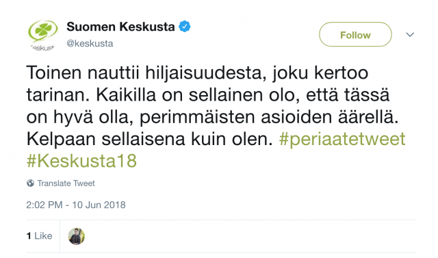 Keskustan puoluekokouksen twiitit olivat kuin Santeri Alkion digitaalinen ilmentymä