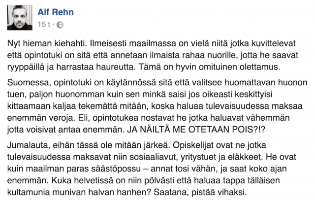 Alf Rehnillä kiehahti opintotukileikkausten takia – syystäkin