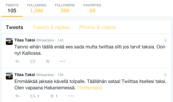 Sometietoiselta taksikuskilta saa kyydin twiittaamalla.