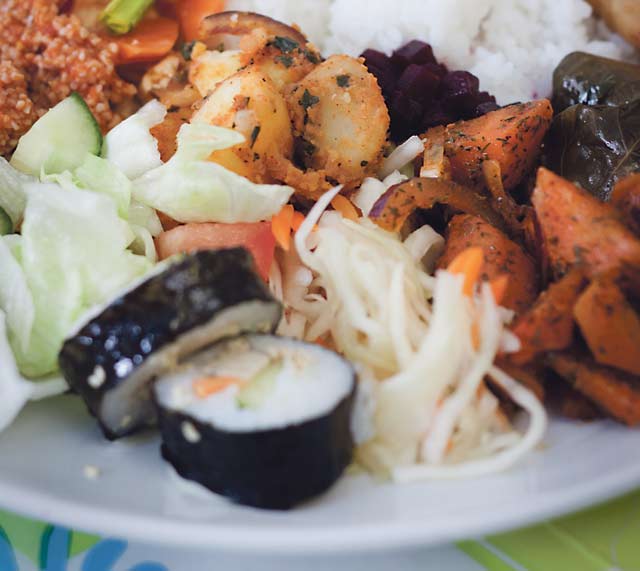 Kasvislounasbuffet, 7,9 e Erilaisia salaatteja, viininlehväkääryleitä, nuudeleita, riisiä, tofukastiketta, makeja Jos kyse ei ole tuoreesta nikkolaisesta yubasta, pidän tofua yhtä houkuttelevana appeena kuin sairaiden lampaiden selkäydinvelliä. Se kun on mautonta…