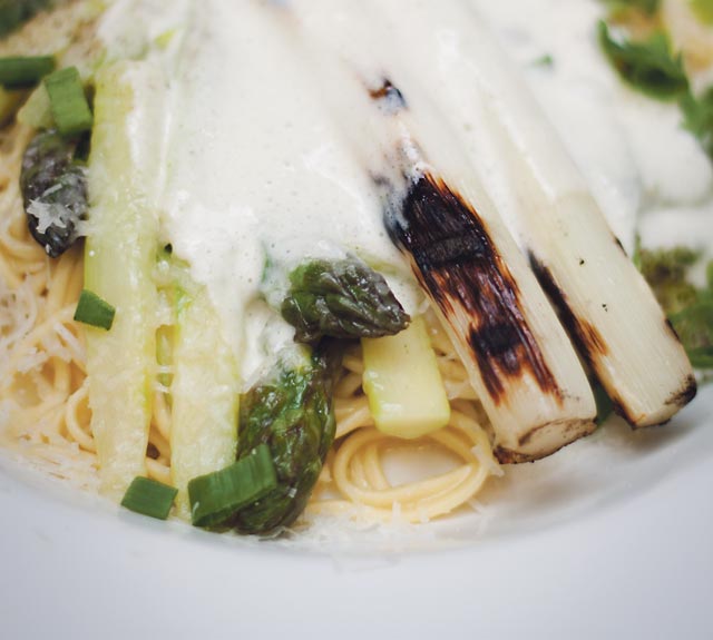 Grillattua parsaa ja linguini-pastaa, 18 e Valkoista ja vihreää parsaa, parmesaanijuustoa, Linguine-pastaa Joissakin piireissä legendaarista mainetta niittäneen Lost & Found -yökerhon raunioille putkahti keväällä uusi yrittäjä. Suolan konseptina on ajallemme…
