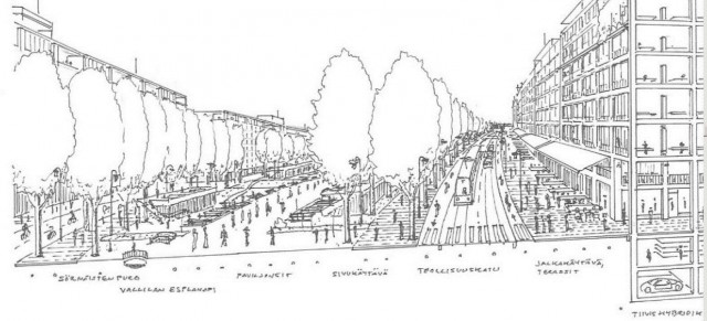 Urban Helsinki -kollektiivin ehdotuksessa Vallilan halkaiseva katu muuttuisi Kalasataman ja Pasilan yhdistäväksi kävelypuistoksi.