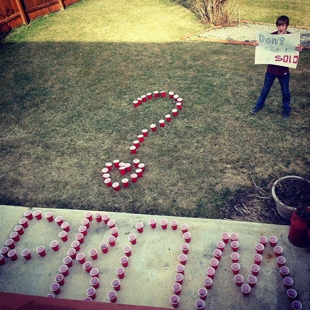 Amerikkalaislukiolaiset harjoittelevat korneja kosintoja yliampuvilla tanssiaiskutsuilla.