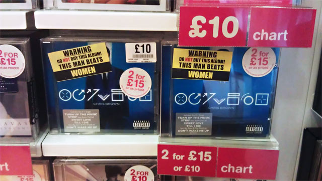 Lontoossa HMV-levykaupassa Chris Brownin levynkansiin ilmestyi erikoinen varoitustarra.