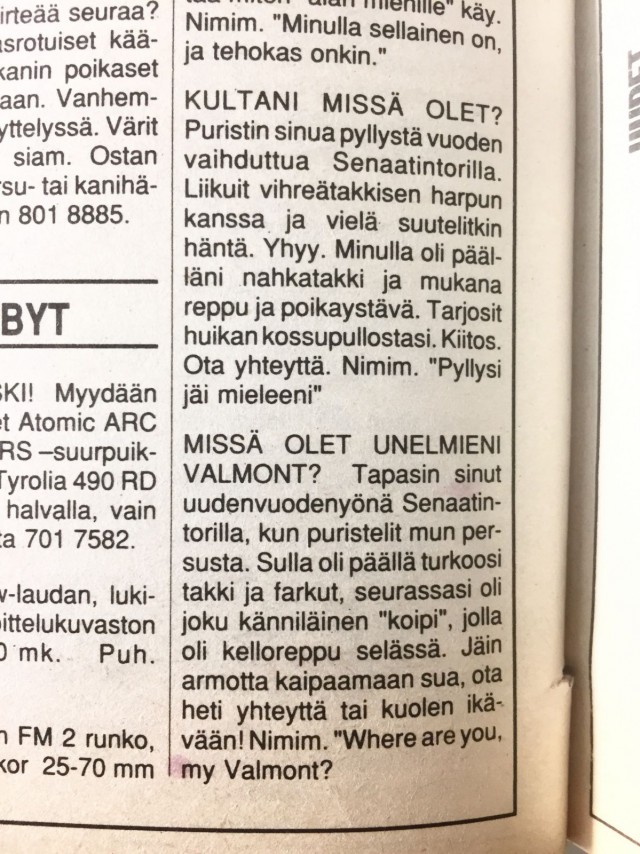 Throwback: etsintäkuulutus Cityn henkilökohtaista-palstalla vuonna 1990