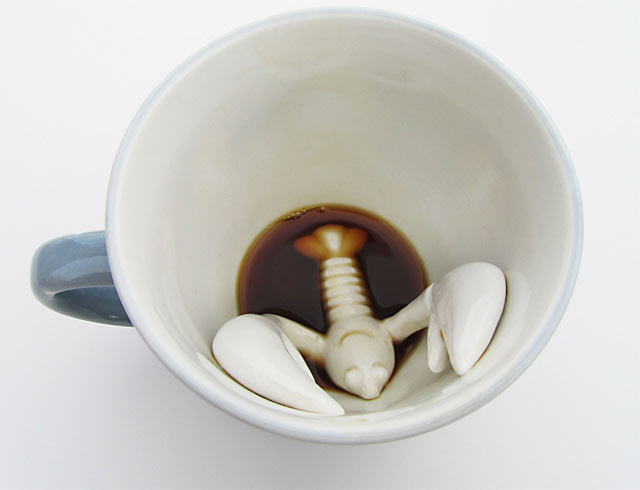 Yumi Yumi -niminen suunnittelijaryhmä tekee hauskoja kahvikuppeja, joiden sisällä vaanivat erilaiset villieläimet. Tällä hetkellä brooklynilaisen ryhmän kupeissa väijyvät mustekala, krokotiili, hai, saukko, pelikaani ja hummeri.