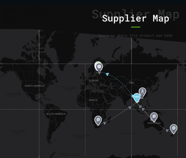 Keskuskadun pop up -kaupasta löytyy tabletteja, joilla sovellusta voi testata (ja se löytyy myös netistä). Vaatteen voi valita sovelluksen valmiista valikosta tai skannata paikan päällä QR-koodilla. Sovellukseen ilmestyy kartta, joka näyttää, että esimerkiksi valitun Formal Fridayn Huckleberry-paidan villa tulee Etelä-Afrikasta, Australiasta ja Uudesta-Seelannista, ja se kudotaan kankaiksi Thaimaassa. Vaate leikataan Virossa ja myös ommellaan siellä, Kiinasta tulevilla langoilla. Tietojen selaaminen on koukuttavaa: missäs tämä on tehty? Entä tuo?