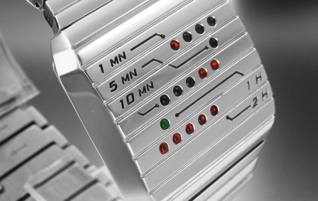 Kuten sisarkello Gravityssä, Mercuryssakin sisempi spiraali merkkaa tunteja, ulompi minuutteja. Kello on 10.12. Metalliranneke, neljä väriyhdistelmää. 149 e.