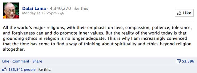 Tämän viikon maanantaina Tiibetin hengellinen johtaja Dalai-lama kertoi yli neljälle miljoonalle Facebook-seuraajalleen, että pelkkä uskonto ei enää riitä.