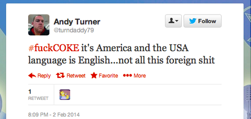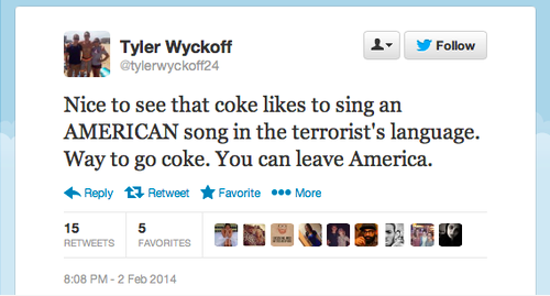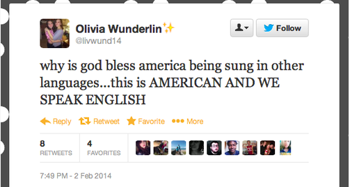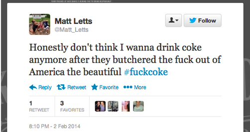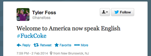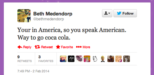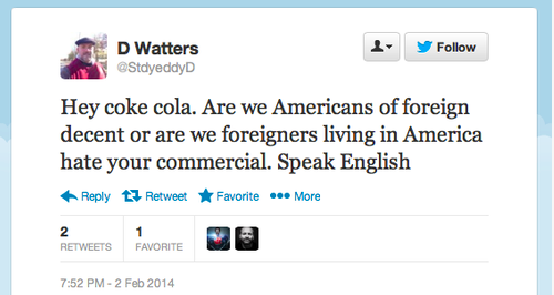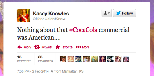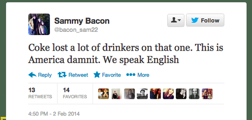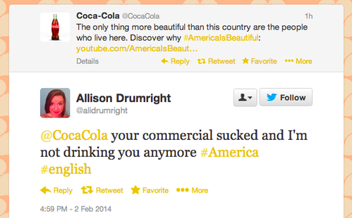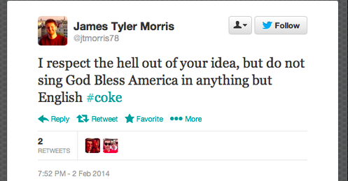 Jotkut sekoittivat mainoksen laulun jopa God Bless America-kappaleeseen, joka on yhdysvaltalainen isänmaallinen laulu. Monille tuntui olevan tärkeää, että Amerikassa puhutaan vain englantia, mutta eivät silti välittäneet siitä, mitä oikeinkirjoitus tarkoittaa. Uskomatonta kuin se onkin, niin näitä twiittejä tulvi Coca-Colalle mainoksen jälkeen. Katso itse alla olevista kuvakaappauksista miten ihmiset suuttuivat.